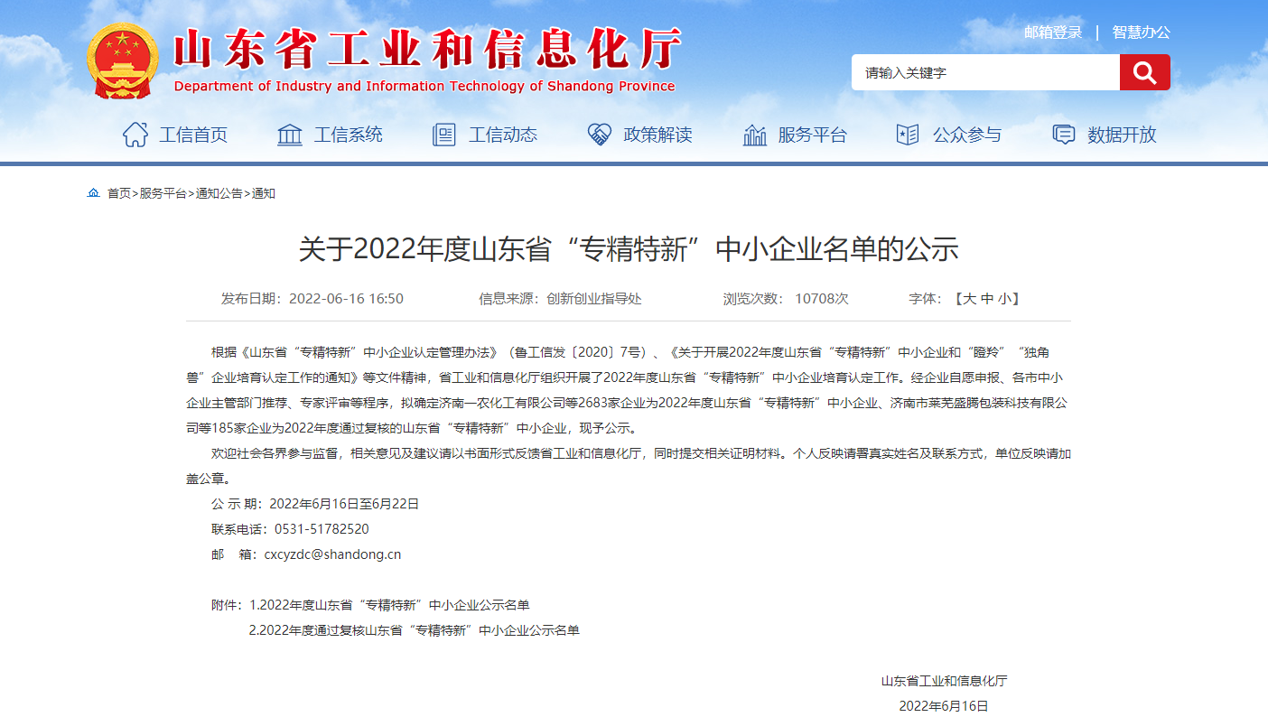喜讯,沃华科技又一省级荣誉获批!在山东省工业和信息化厅网站刚刚公布的,2022年度山东省“专精特新”中小企业公示名单中,山东沃华农业科技股份有限公司榜上有名!