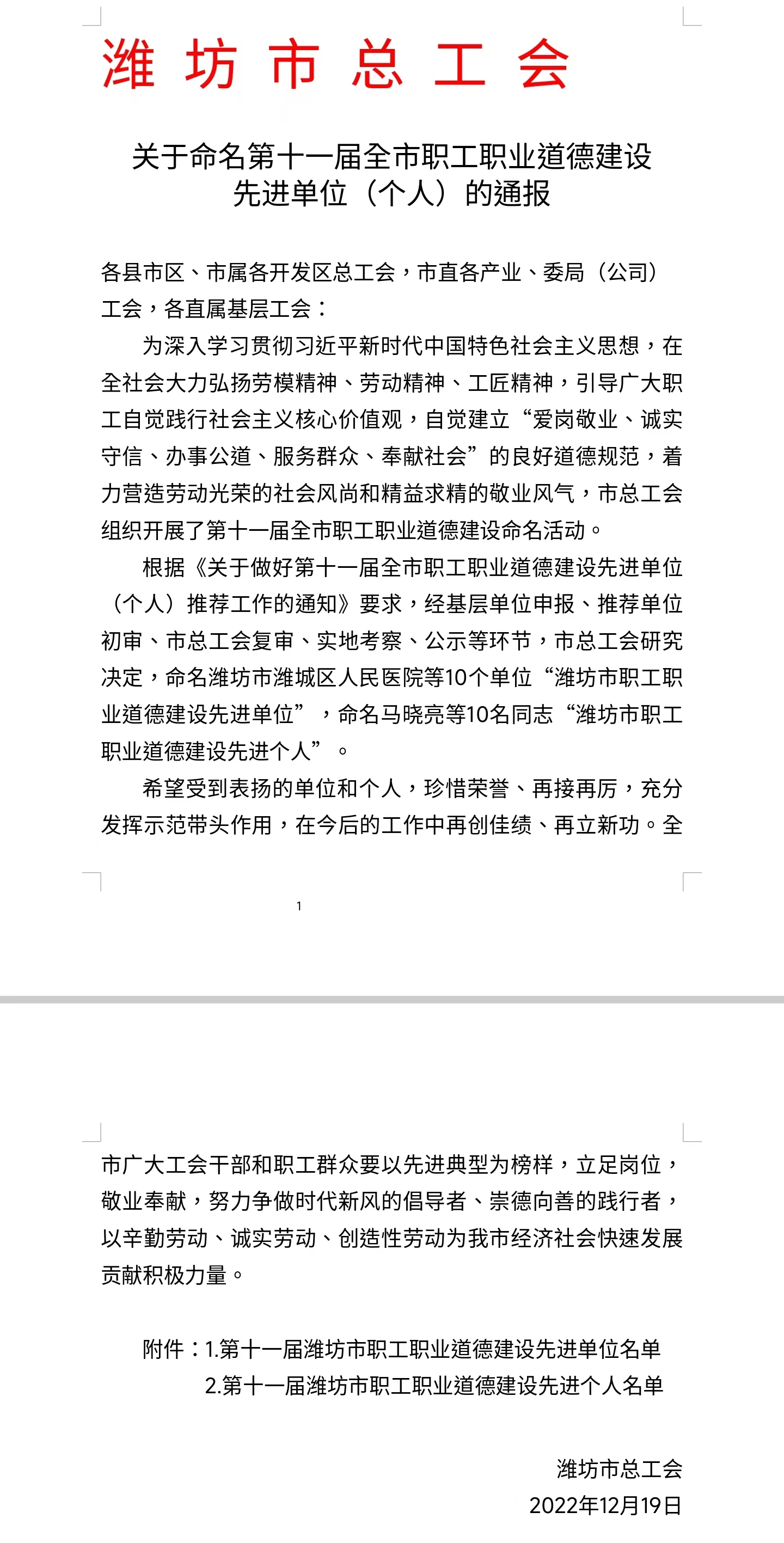 2022年12月19日,濰坊市總工會頒發了《關于命名第十一屆全市職工職業道德建設先進單位(個人)的通報》,山東沃華榮獲濰坊市職工職業道德建設先進單位榮譽稱號。